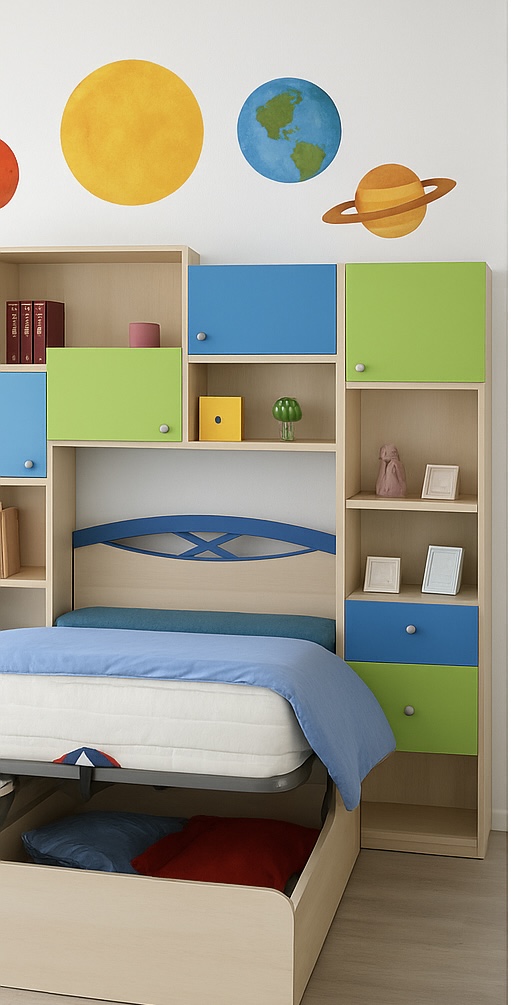 Το κρεβάτι διαθέτει αποθηκευτικό χώρο με ανοιγόμενο μηχανισμό. Αξιοποιείς εύκολα τον διαθέσιμο χώρο και οργανώνεις παιχνίδια, σκεπάσματα ή ό,τι άλλο χρειάζεσαι. Διατηρείς το δωμάτιο καθαρό, τακτοποιημένο και απόλυτα λειτουργικό, χωρίς να θυσιάζεις ούτε το στυλ ούτε την άνεση.
